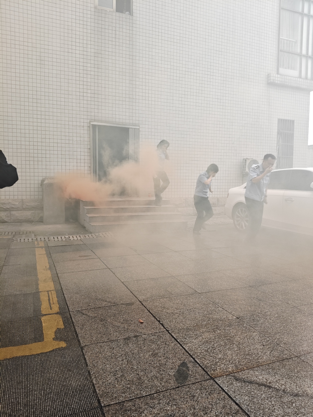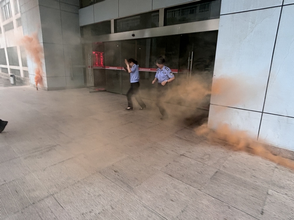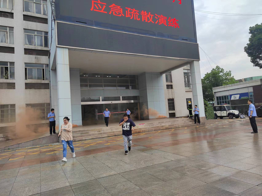 下午15:10演练开始,行政楼值班人员发现模拟火情和烟雾后立即向保卫处负责同志报告。保卫处一边组织附近人员扑救,一边在行政楼前拉响警报,通知后勤保障组切断行政楼电源,学院消防志愿服务队队员迅速进入办公楼组织各楼层教职工紧急疏散。参演教职工迅速从工作岗位有序、快速撤离到指定地点,各单位负责人清点人数并上报。