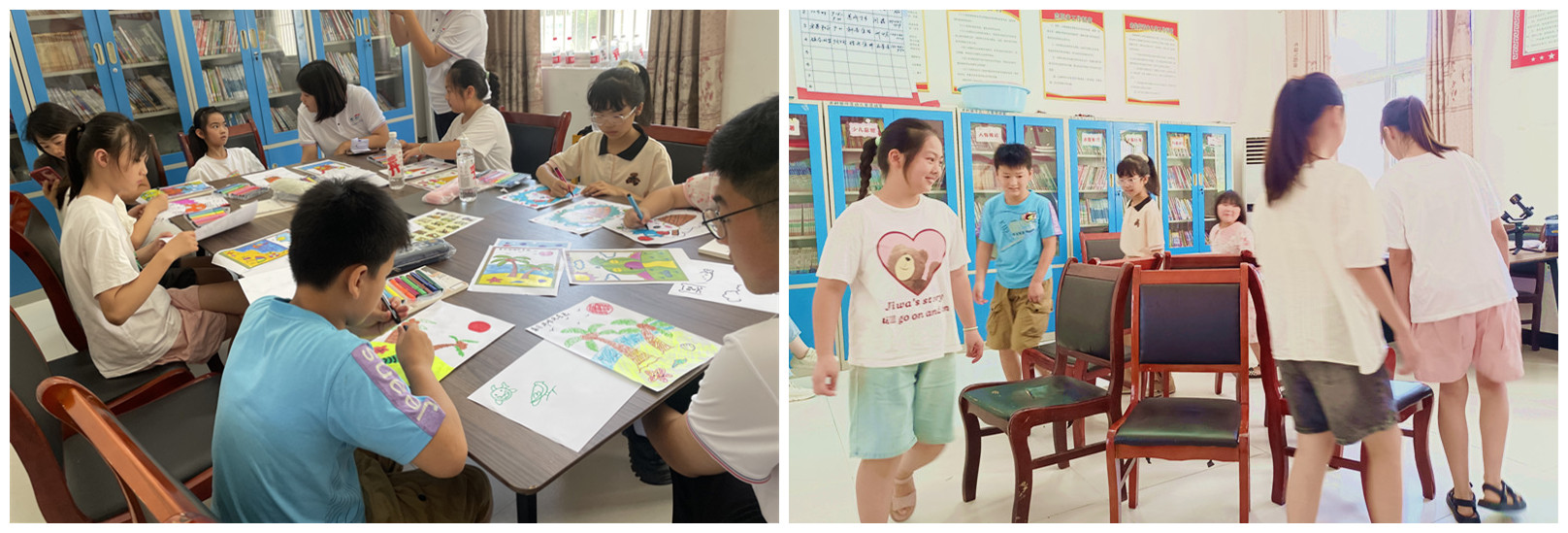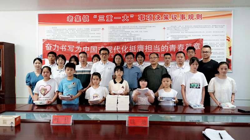 为丰富乡村儿童的精神文化生活,关心留守儿童和困境儿童,7月30日上午,实践团队在临泉县老集镇镇政府举行了图书文具捐赠活动。捐书仪式后,队员们通过破冰小游戏快速拉近了与孩子们之间的距离,与孩子们一起画画,分享各自的故事,现场气氛温馨融洽。