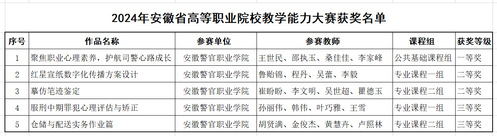 据悉,本次大赛共收到64所高职院校报送的参赛作品455件(审核通过443件),经过网络初评和现场决赛,共评选出获奖作品275件,其中一等奖作品48件、二等奖作品92件、三等奖作品135件。在本次大赛中,我院推荐的6支参赛队有5支斩获佳绩。其中,学生处王世民教师团队参赛队作品《聚集职业心理素养,护航司警心路成长》荣获公共课程组一等奖,警察系崔盼盼教师团队参赛队作品《模仿笔迹鉴定》和信息管理系鲁贻锦教师团队参赛队作品《红星宣纸数字化传播方案设计》荣获专业课程组二等奖,警察系孙丽伟教师团队参赛队作品《服刑中期罪犯心理评估与矫正》和信息管理系胡贤满教师团队参赛队作品《仓储与配送实务作业篇》荣获专业课程组三等奖。
