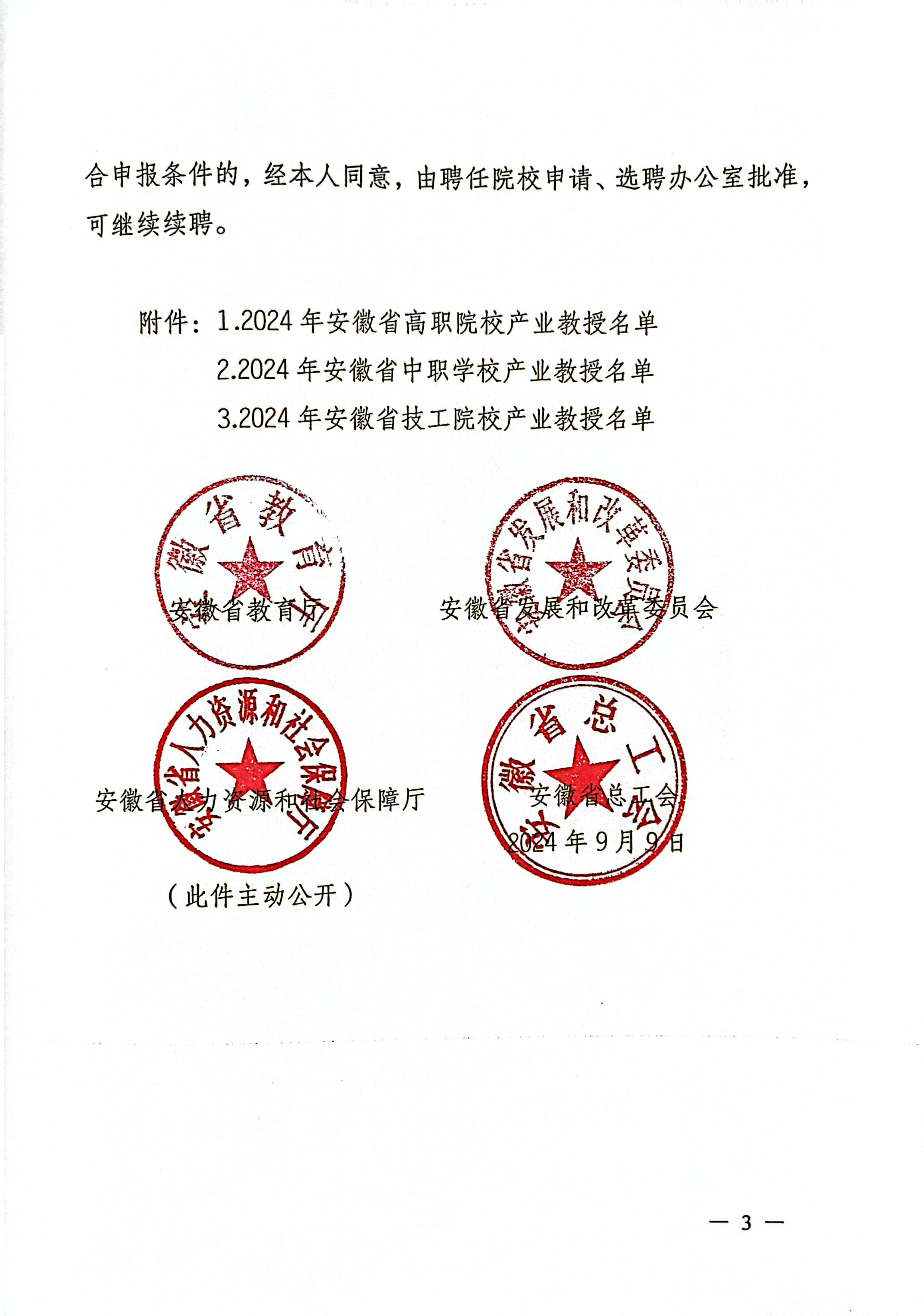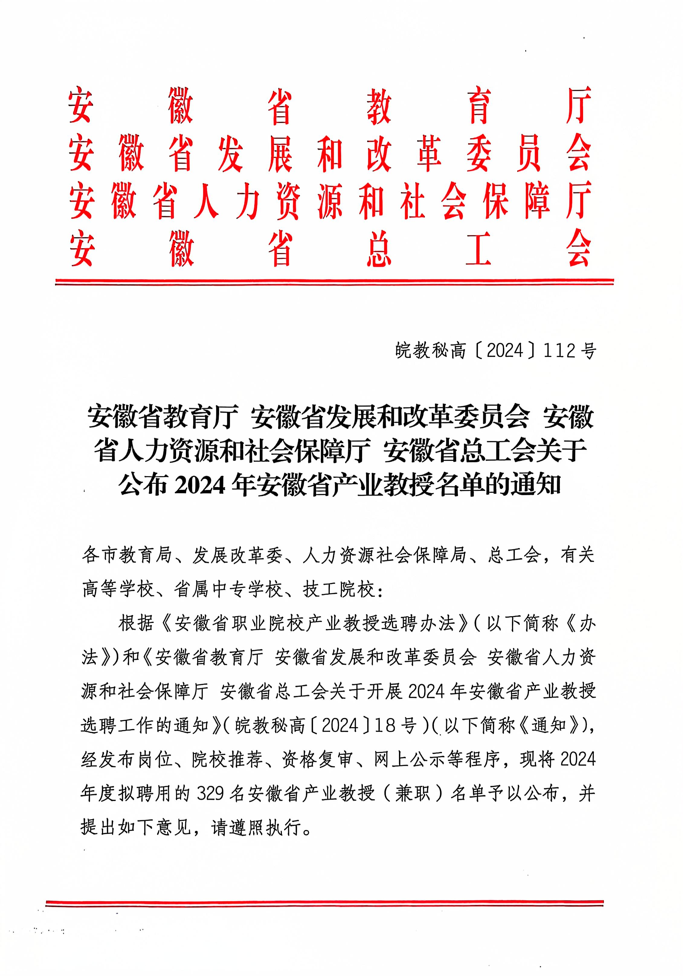 根据《安徽省教育厅 安徽省发展和改革委员会 安徽省人力资源和社会保障厅 安徽省总工会关于公布2024年安徽省产业教授名单的通知》(皖教秘高〔2024〕112号)文件精神,我院推荐申报5位兼职教师获批安徽省高职院校类产业教授。