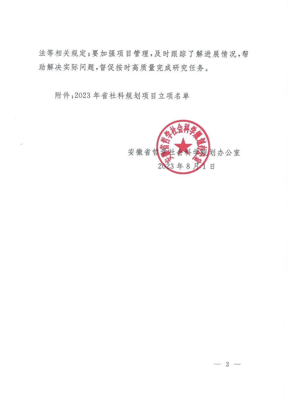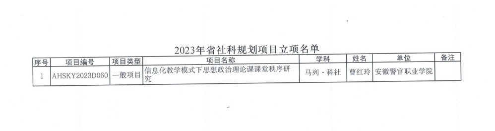 近日,安徽省社科规划办公室发布了2023年度安徽省哲学社会科学规划项目立项名单(皖社科规划办〔2024〕9号),我院曹红玲教授申报的课题《信息化教学模式下思想政治理论课课堂秩序研究》获批立项。