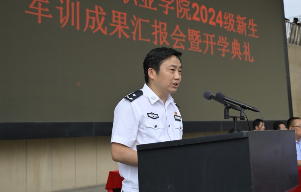 桂勇在讲话中对同学们圆满完成各项训练任务表示衷心祝贺,对教官和老师们辛勤付出表示感谢,对军训汇报成果予以充分肯定。他指出,军训作为大学生活的第一堂课,其意义远不止于简单的队列训练和体能挑战,它是一场关于信念、勇气与责任的深刻洗礼,希望同学们能够将军训中学到的宝贵品质和精神风貌带入日常的学习和生活中去,在学习上追求卓越、勇于探索;在生活中严于律己、宽以待人;铭记军训的初心和使命,牢记“明德尚法,弘毅致远”的校训,以实际行动诠释新时代警院学子的责任与担当。