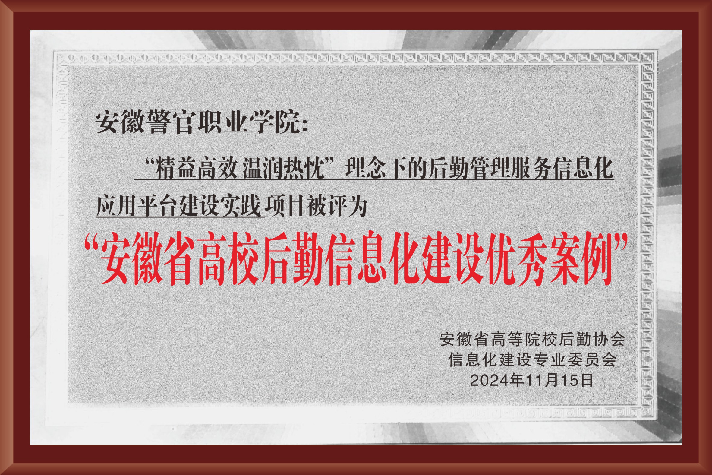 近日,安徽省高等院校后勤协会信息化建设专业委员会公布了全省高校后勤信息化建设优秀案例征集与评选结果,学院申报的《“精益高效温润热忱”理念下的后勤管理服务信息化应用平台建设实践》获评为安徽省高校后勤信息化建设优秀案例。11月15日,在马鞍山召开的安徽省高等院校后勤协会节能及信息化建设专业委员会2024年度会员大会上对获评案例单位进行了授奖,学院总务处派员参会。