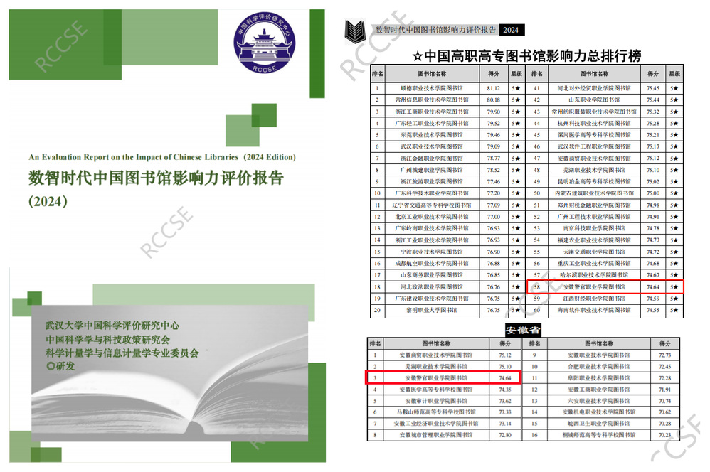 日前,武汉大学中国科学评价研究中心、中国科学学与科技政策研究会科学计量学与信息计量学专业委员会联合发布《数智时代中国图书馆影响力评价报告(2024)》,对我国2820所普通高校图书馆(包括1545所高职高专院校图书馆)进行评价。学院图书馆被评为“五星图书馆”(同类型图书馆排名前10%授予“五星图书馆”荣誉称号,为具有突出影响力单位),在中国高职高专图书馆影响力总排行榜中位列第58名,在安徽省高职高专图书馆中位列第3名。