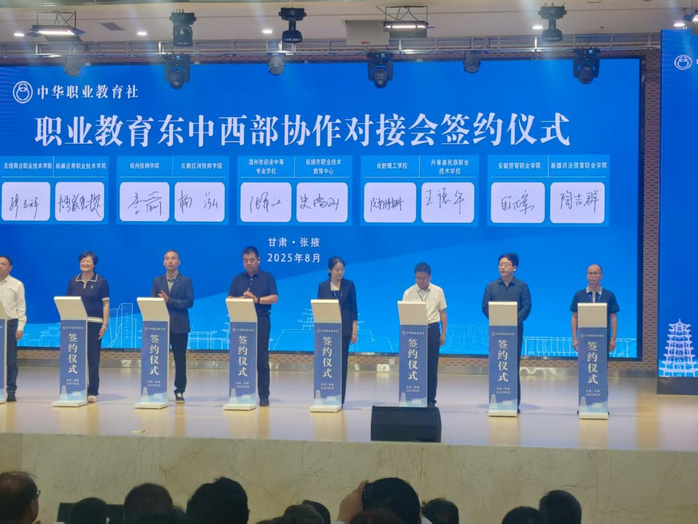 8月25日至26日,由中华职业教育社主办的职业教育东中西部协作对接会在甘肃省张掖市召开。全国人大常委会副委员长、中华职业教育社理事长郝明金出席开幕式并讲话。来自全国各地的130余所职业院校、企业参加会议,深入交流研讨,精准对接需求。职业教育东中西部协作对接会旨在引进东中部发达地区职业教育资源,就西部地区、边疆地区、民族地区职业教育发展中遇到的问题和发展需求,搭建智力支持、人才培养、产业发展相结合的职业教育东中西部协作平台,为推动区域协调发展、高质量发展贡献职教力量。