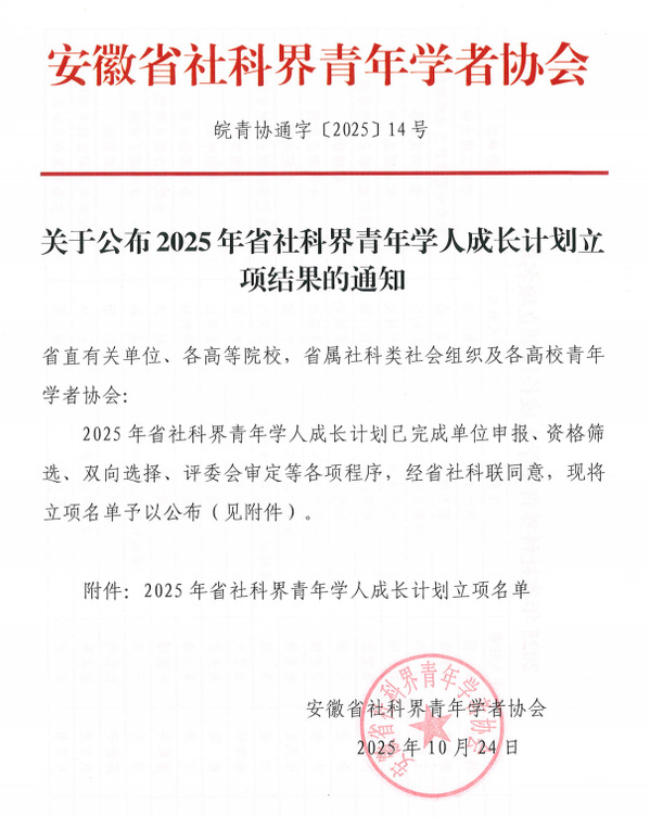 近日,安徽省社科届青年学者协会公布了2025年省社科界青年学人成长计划立项结果,我院杨颖、张洁、孙佳、郭琪、王宁五名青年教师获批立项。