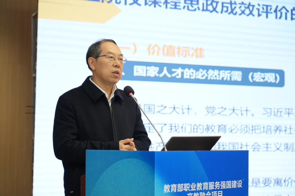 教育部职业院校文化素质教育指导委员会副主任委员、重庆工业职业技术学院原党委书记王官成,作了题为《职业院校课程思政成效评价的标准、路径与修正》报告,他从“标准、路径、修正”三个维度,为课程思政成效评价提供了“可操作、可落地”的方案。