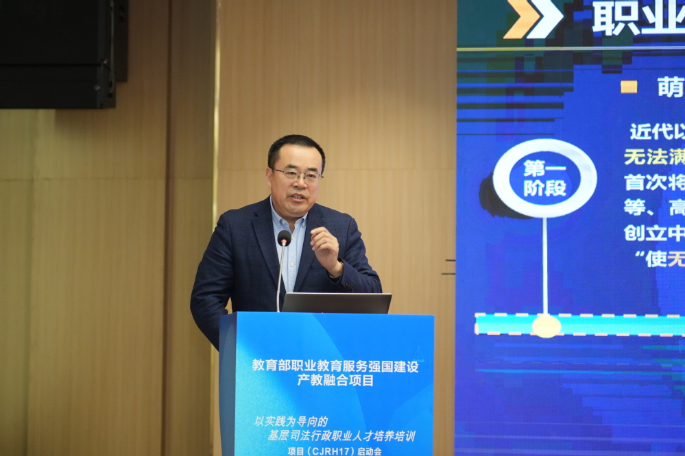 启动会上,吕伟耀代表指导单位致辞,他指出,该项目是落实教育强国、人才强国战略的重要举措,其根本目标是培养一大批“下得去、留得住、用得上、干得好”的高素质基层司法行政职业人才。