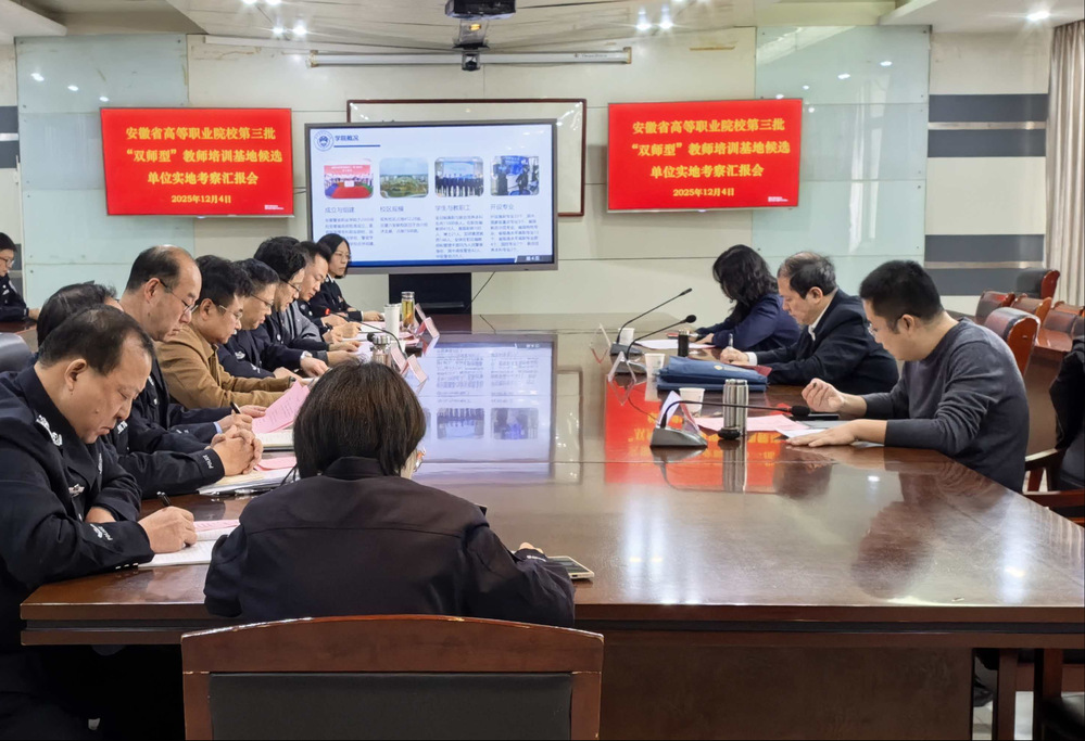 12月4日下午,安徽省高等职业院校第三批“双师型”教师培训基地候选单位实地考察组一行莅临我院,就我院基地申报建设情况开展实地考察。考察组组长由省教师发展中心主任朱曙培担任,安徽审计职业学院教务处处长丁丁、省教师发展中心干部殷旭梅作为成员参与考察。学院党委副书记、院长操申斌主持专题汇报会,党委委员、副院长欧元军作主题汇报。
