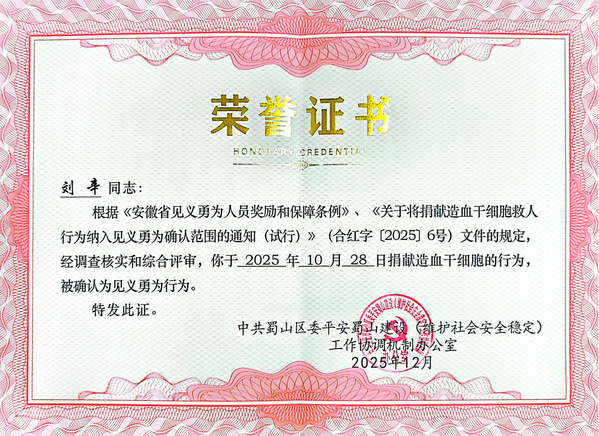刘辛同学自18岁起便投身无偿献血公益事业,于2023年11月加入中华骨髓库,他始终期盼为生命“续航”。2025年10月28日,他在中国科学技术大学第一附属医院成功捐献造血干细胞,挽救了一位千里之外的“80后”急性淋巴性白血病患者,挽救了一位母亲,也为一个家庭带去了希望。他积极推动身边人了解造血干细胞留样,开展捐献知识科普,用“生命种子”传递大爱,以实际行动带动身边人投身公益事业,延续人间善意,展现了当代青年助人为乐、奉献社会的精神风貌。