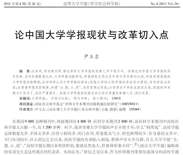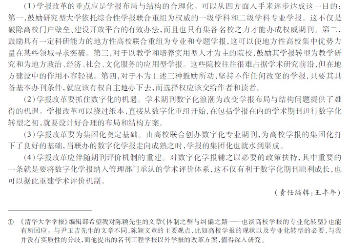 随着出版体制改革的逐步深入,社会各界对学术期刊尤其大学综合性学报的议论越来越多。《清华大学学报》一直关注期刊改革、期刊评价和学术规范问题,陆续邀请学者发表意见。