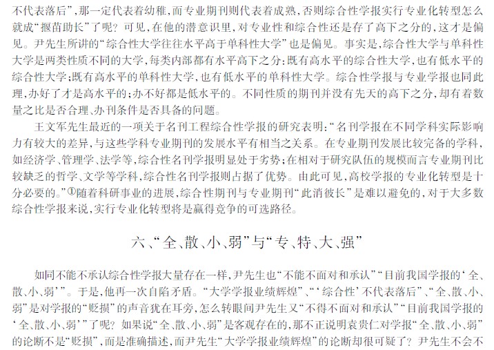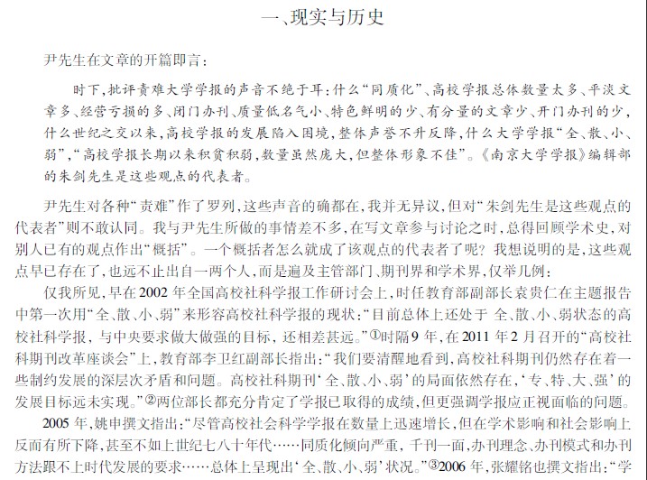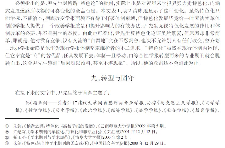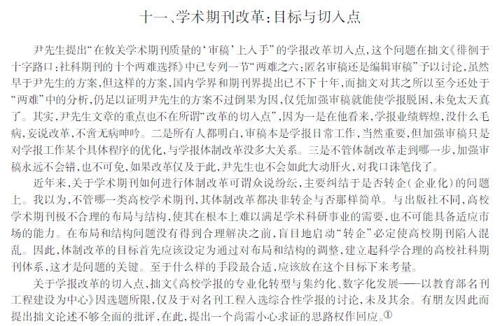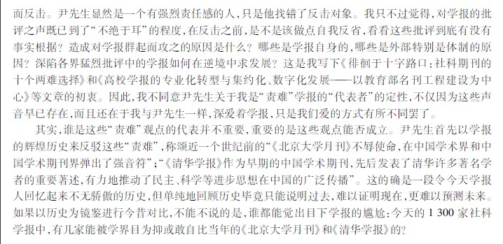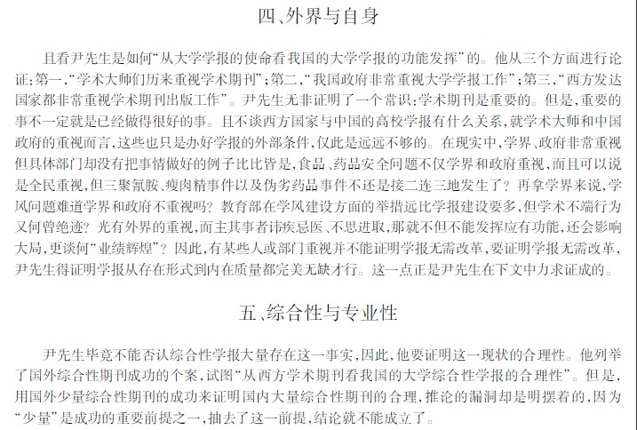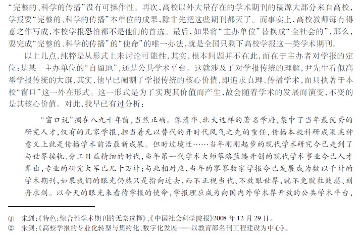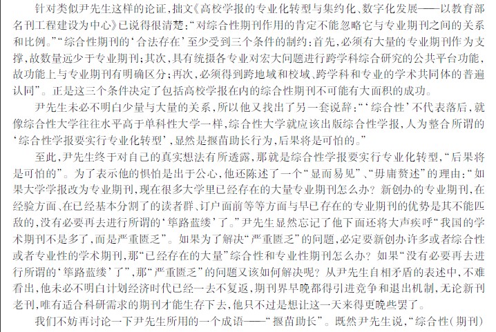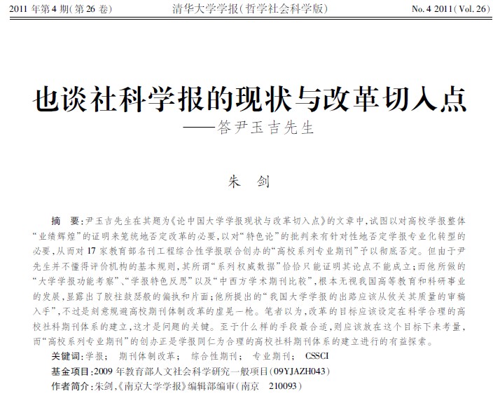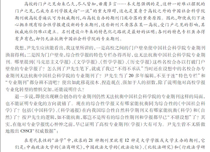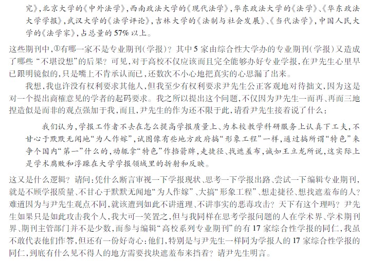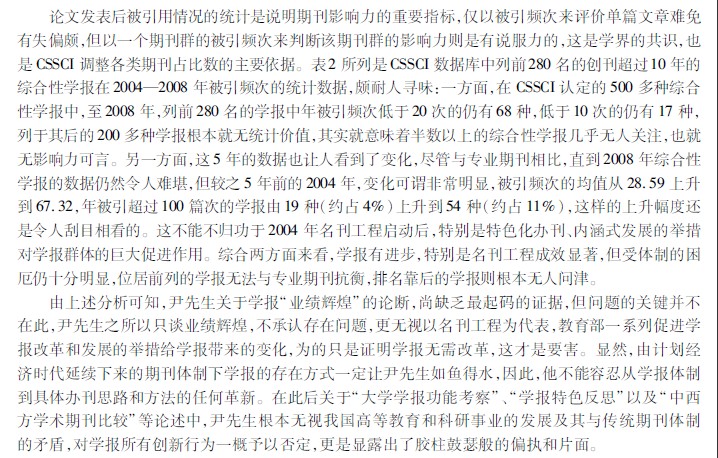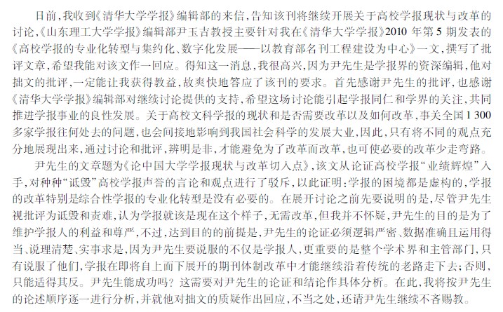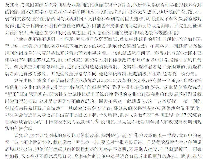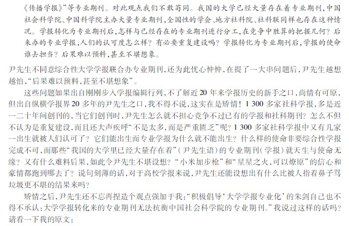 也有学者提出不同意见,尹玉吉给本刊写来专文《论中国大学学报现状与改革切入点》,明确反对朱剑的观点,提出高校综合性学报的存在不仅有其合理性,而且业绩辉煌,学报的专业化转型既无必要,也是行不通的。为了将此问题的讨论引向深入,征得二位作者同意,编辑部请朱剑做了回应文章《也谈社科学报的现状与改革切入点》。朱剑在回应文章中指出尹玉吉的文章不仅引用数据失当,而且“对资料的断章取义、张冠李戴、常识错误、逻辑混乱、自相矛盾之处”比比皆是,他的观点根本不能成立。本期将他们三人的文章一同发表,孰是孰非,请学界和期刊界同仁共同讨论。