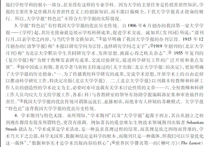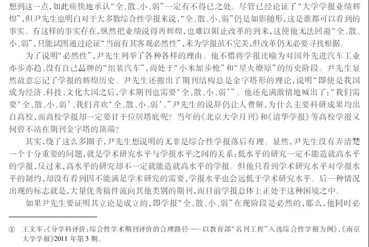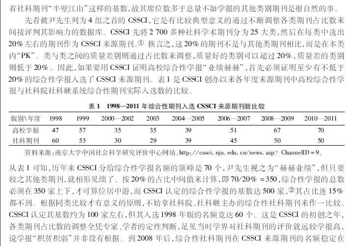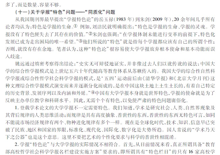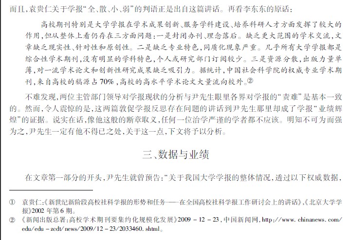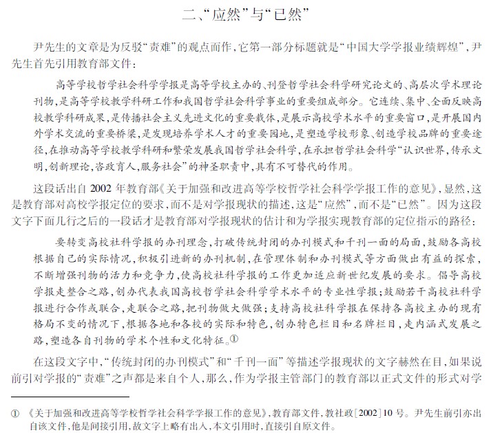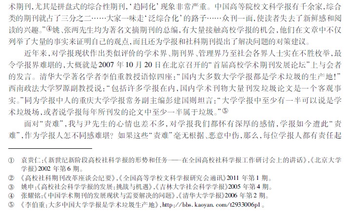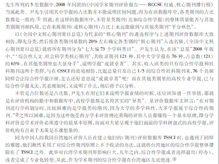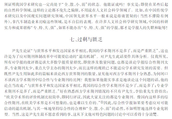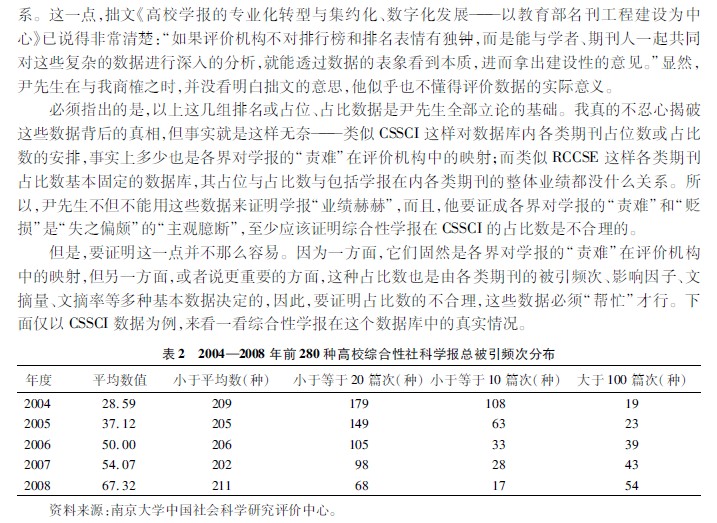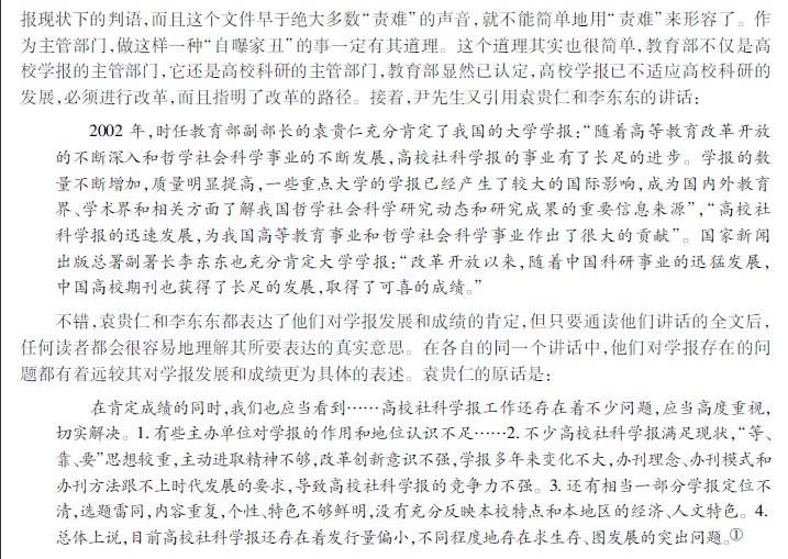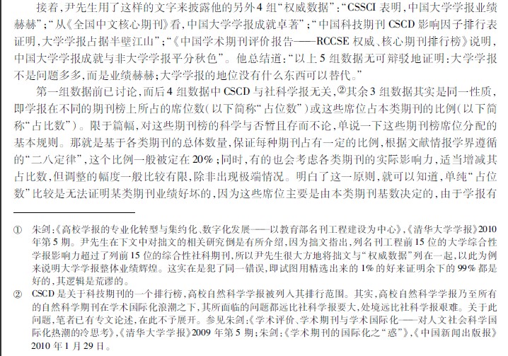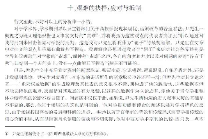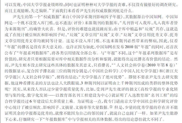也有学者提出不同意见,尹玉吉给本刊写来专文《论中国大学学报现状与改革切入点》,明确反对朱剑的观点,提出高校综合性学报的存在不仅有其合理性,而且业绩辉煌,学报的专业化转型既无必要,也是行不通的。为了将此问题的讨论引向深入,征得二位作者同意,编辑部请朱剑做了回应文章《也谈社科学报的现状与改革切入点》。朱剑在回应文章中指出尹玉吉的文章不仅引用数据失当,而且“对资料的断章取义、张冠李戴、常识错误、逻辑混乱、自相矛盾之处”比比皆是,他的观点根本不能成立。本期将他们三人的文章一同发表,孰是孰非,请学界和期刊界同仁共同讨论。