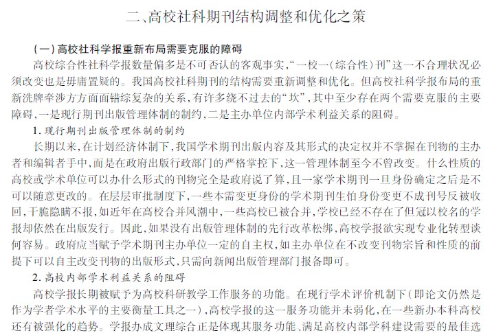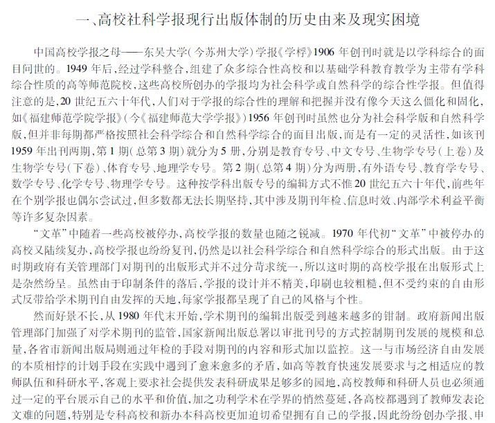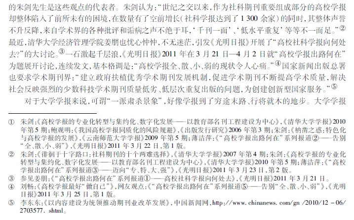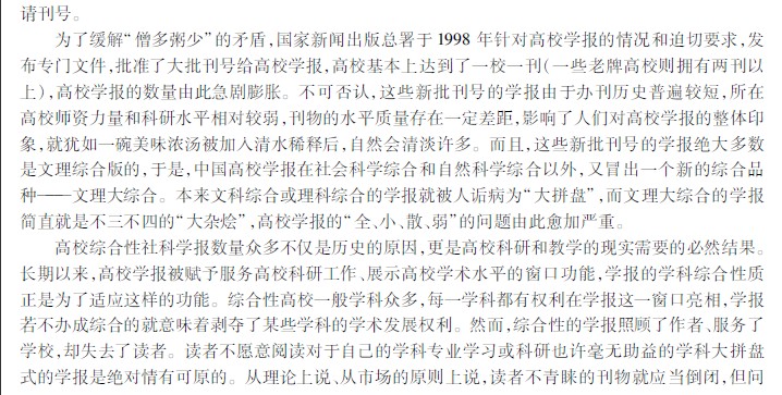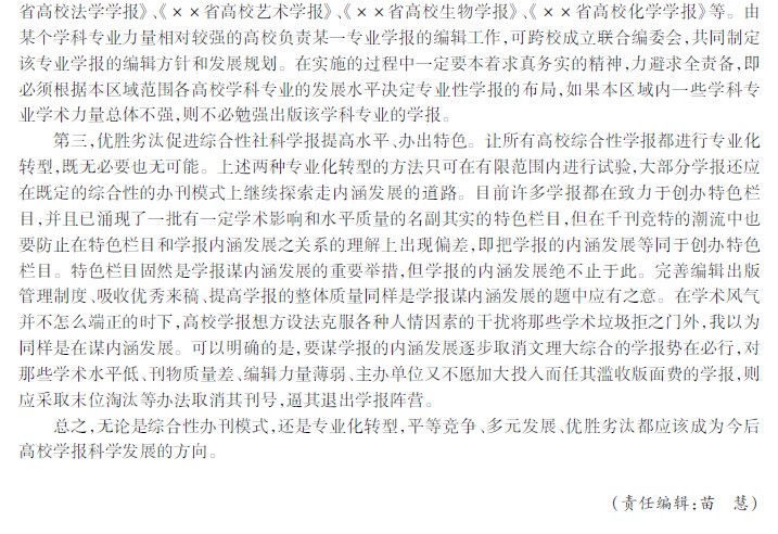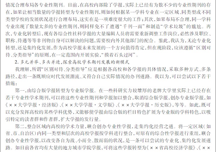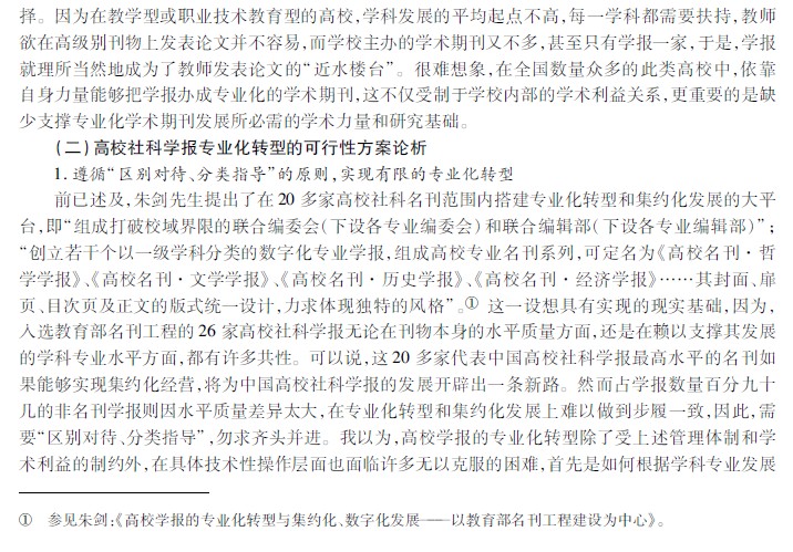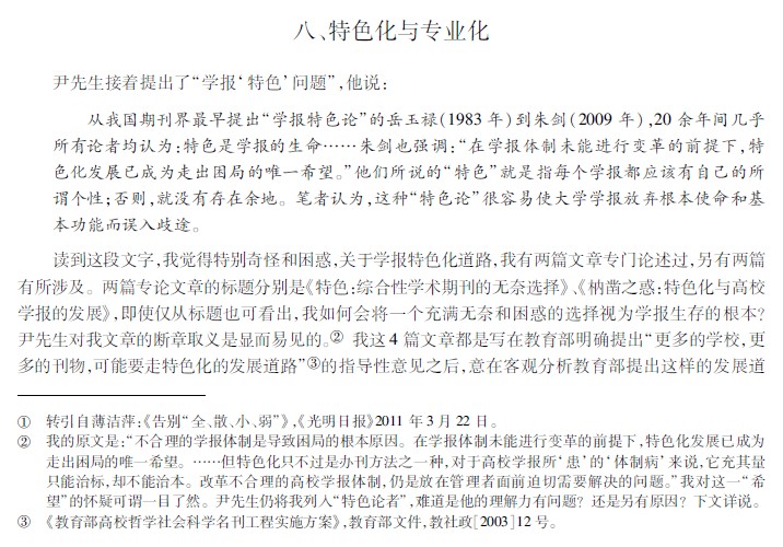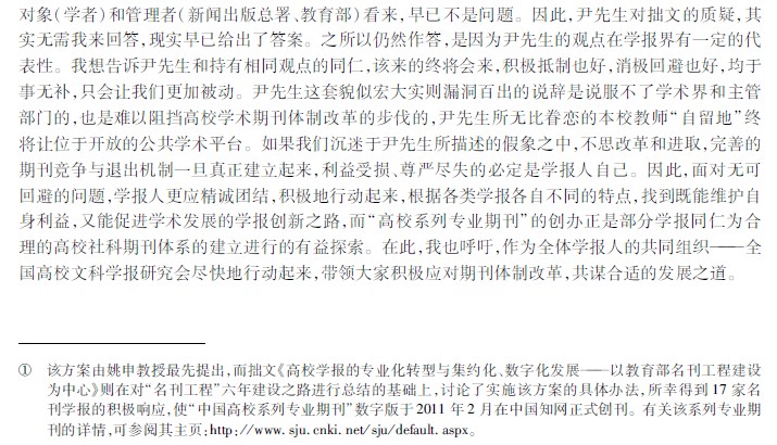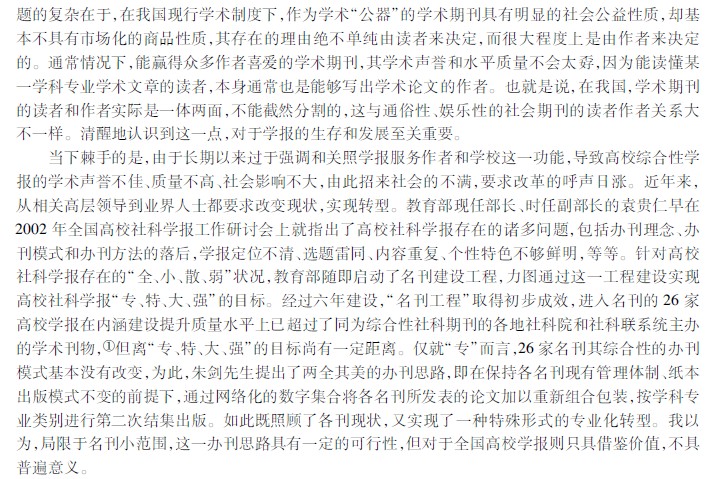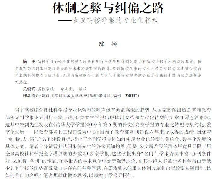 2011年3月,全国17家综合性名刊学报联合创办了数字化的“中国高校系列专业刊”(共10种专业刊,在中国知网以“开放获取”的方式刊布,可免费阅读和下载),引起学界和学术期刊界的高度重视。同时,名刊学报专业化转型的设想和方案的提出也在学报界激起了反响,陈颖寄来文章《体制之弊与纠偏之路》,在提出个人观点的同时,将综合性学报的专业化转型从名刊学报推及了普通院校学报,从而对朱剑文章做了很好的补充。