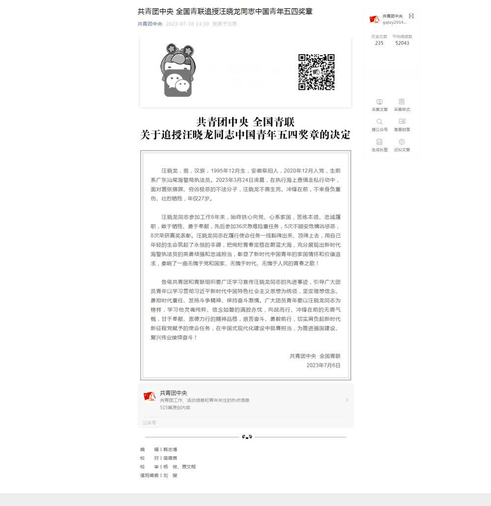 【共青团中央】共青团中央 全国青联追授汪晓龙同志中国青年五四奖章