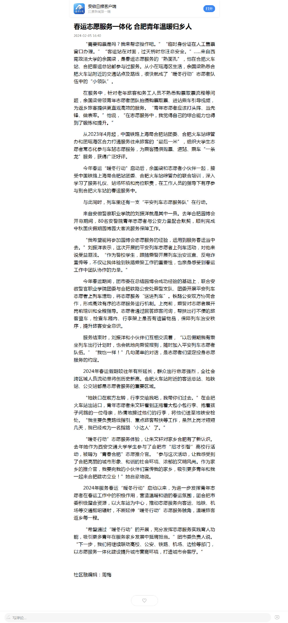 【安徽日报客户端】春运志愿服务一体化 合肥青年温暖归乡人
