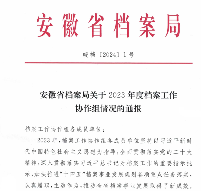 近日,安徽省档案局对全省2023年度档案工作协作组情况进行了通报,我院荣获2023年度档案工作协作组成绩突出成员单位。