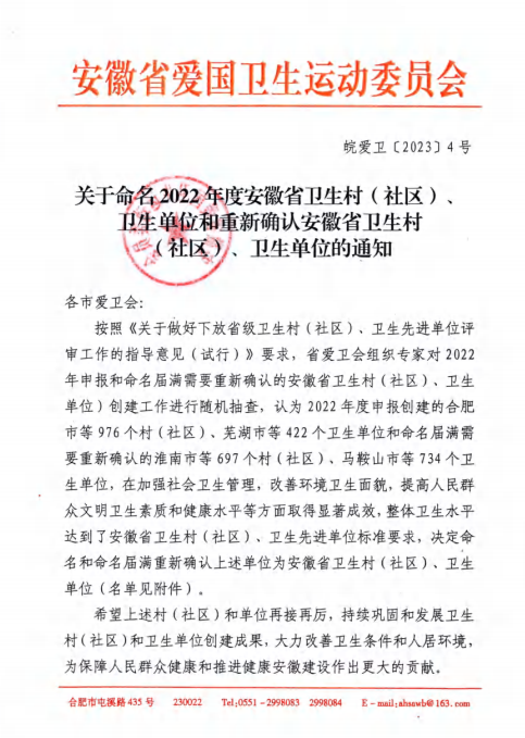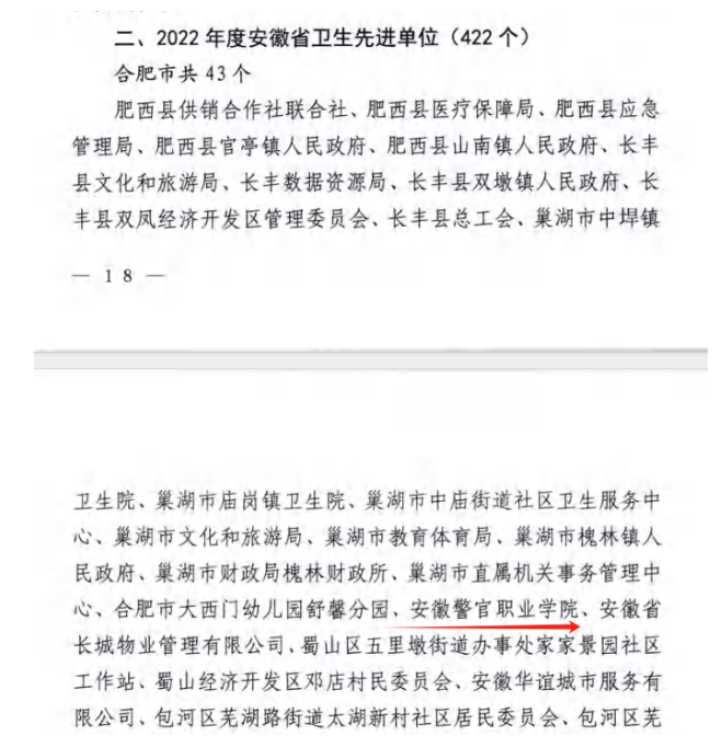 日前,省爱国卫生运动委员会通报命名了2022年度安徽省卫生村(社区)、卫生单位和重新确认安徽省卫生村(社区)、卫生单位,学院被授予2022年度“安徽省卫生先进单位”称号。