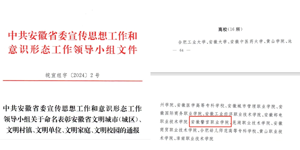 学院获批全国学校急救教育试点学校,获评全国司法行政系统先进集体1个,立项省“双高计划”学校和专业群建设单位、地方技能型高水平大学、省课程思政建设先行高校;师生入选中国好人5名、安徽好人5名,好人数位居安徽省高校首位;先后6名学生荣获“中国大学生自强之星”,涌现出全国模范检察官王敏、全国先进工作者张文博、全国最美公务员刘晓妮、中国青年五四奖章获得者汪晓龙烈士等先进模范人物校友;“青春安警院”等新媒体文化品牌在全国产生广泛影响,文明校园建设取得了显著经验成绩。