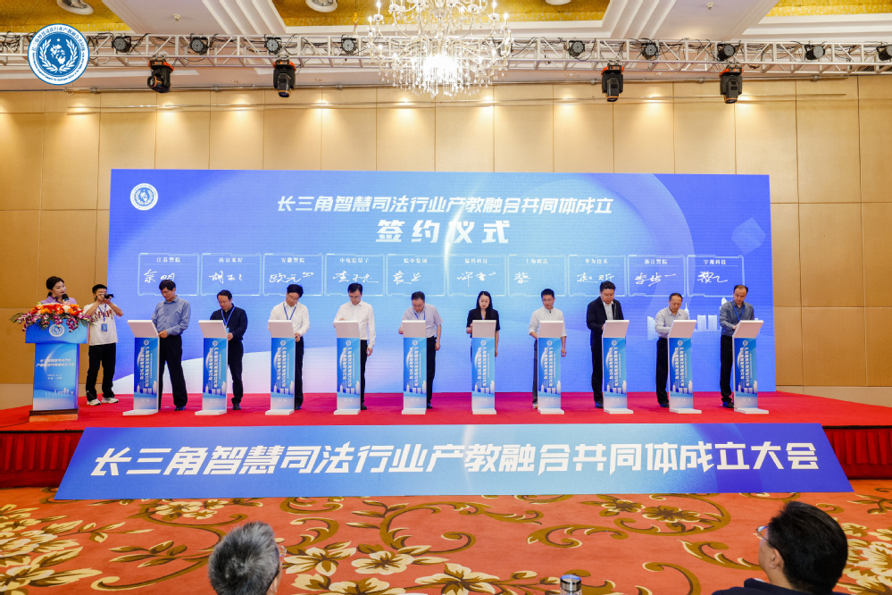 10位与会领导和嘉宾共同启动了按钮,宣布“长三角智慧司法行业产教融合共同体”正式成立。会上,举行了共同体理事长单位、副理事长单位等授牌仪式,校企合作签约仪式,播放了智慧司法行业产教融合、校企合作成果展示视频。