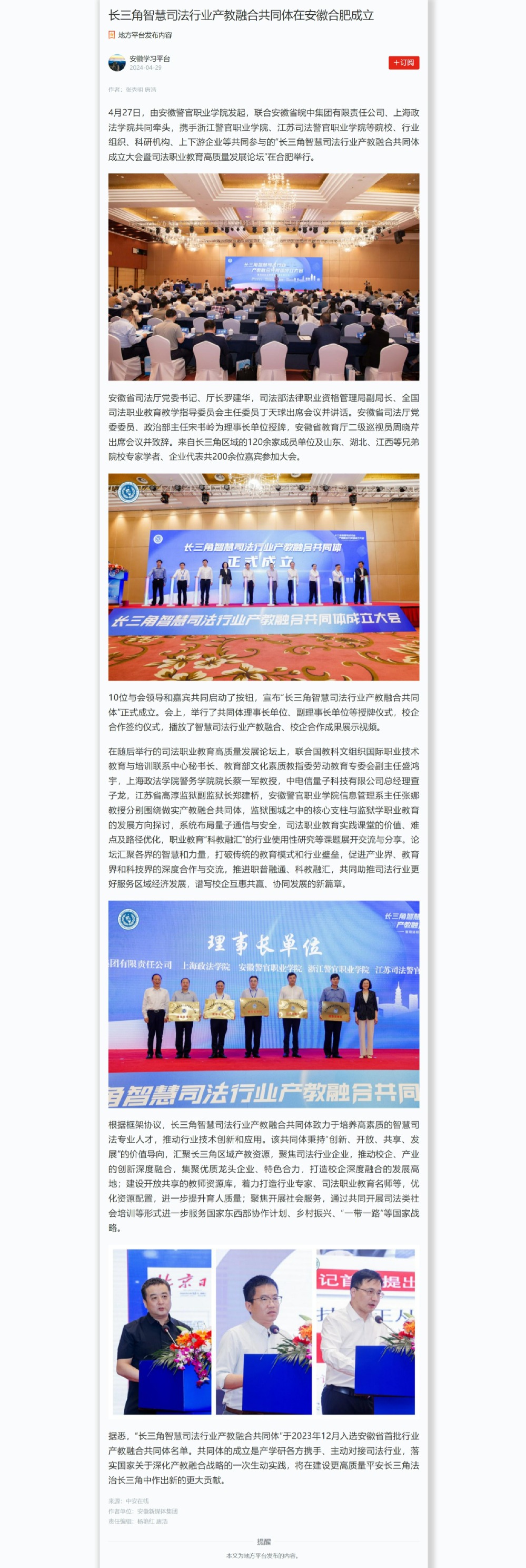 【学习强国】长三角智慧司法行业产教融合共同体在安徽合肥成立