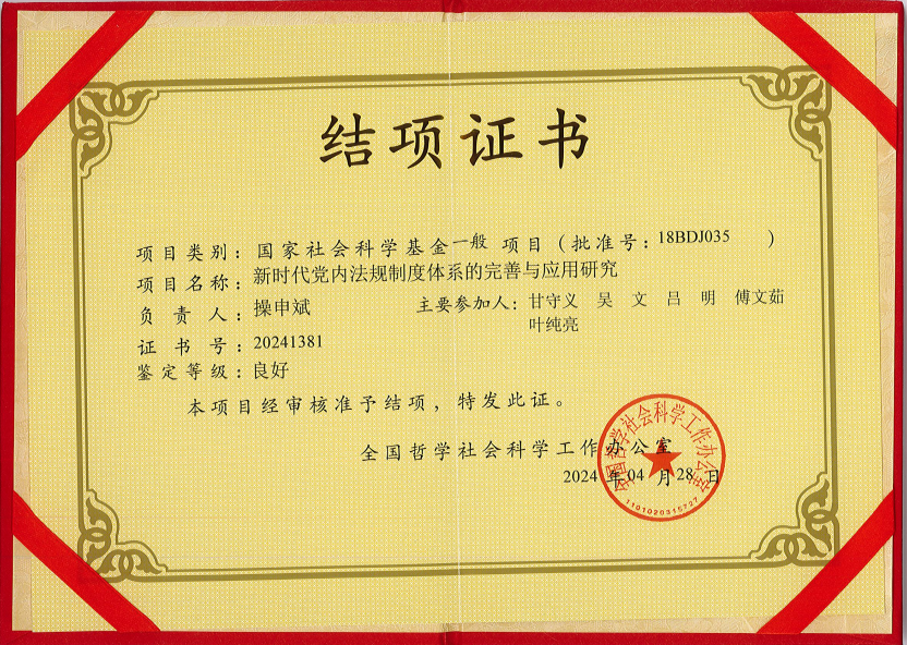 近日,全国哲学社会科学规划办公室公布了2024年4月国家社科项目结题情况,学院操申斌教授主持的国家社科基金一般项目《新时代党内法规制度体系的完善与应用研究》(批准号:18BDJ035),通过审核顺利结题,鉴定获批“良好”等级。