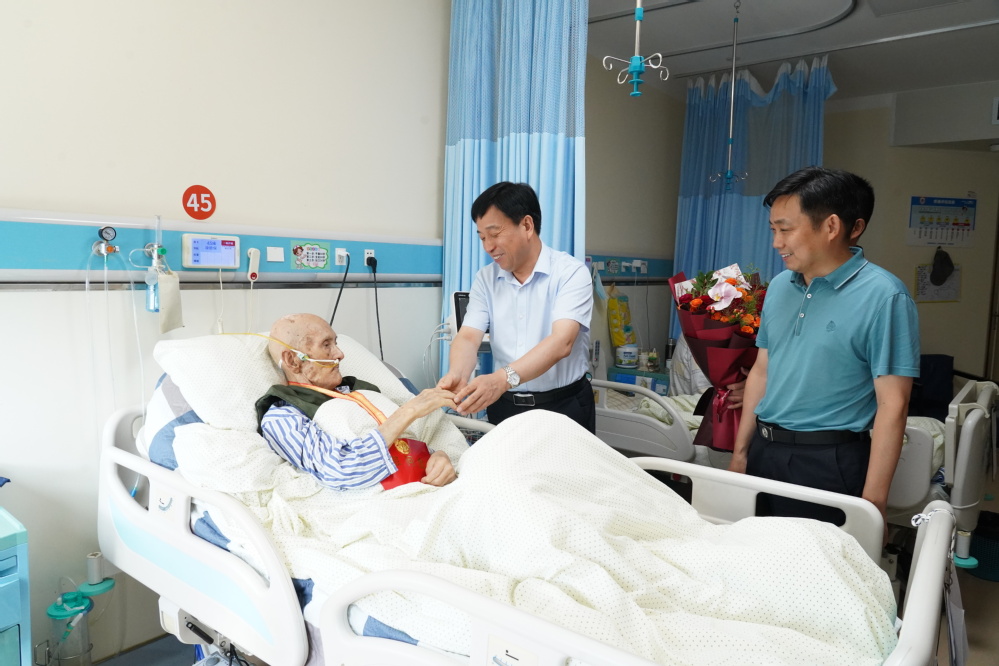 8月27日上午,省司法厅党委委员、副厅长唐华军,学院党委书记桂勇一行前往医院,看望正在疗养的96岁高龄抗日离休干部凌德保同志。唐华军细致了解凌老的治疗进展和日常生活安排,希望他安心休养、祝福他健康长寿,并为他颁授“中国人民抗日战争胜利80周年”纪念章。唐华军叮嘱相关工作人员要带着感情,一如既往地关心关爱老战士、老同志,深入细致做好服务工作,让他们安享晚年。