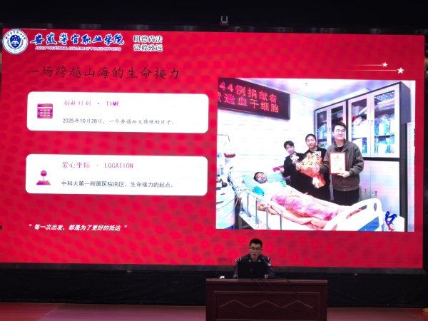 活动特邀合肥市中心血站工作人员及我院首例造血干细胞捐献者、法律二系刘辛同学担任主讲人。血站工作人员结合自身工作经历,系统讲解了无偿献血的政策法规、科学流程及常见误区,重点阐述了献血在保障临床用血安全、挽救生命方面的重要意义。作为身边榜样的刘辛,则从青年志愿者的视角出发,分享了自己捐献造血干细胞的亲身经历与心路历程,以真实的朋辈引导号召同学们用实际行动践行新时代青年的责任与担当。