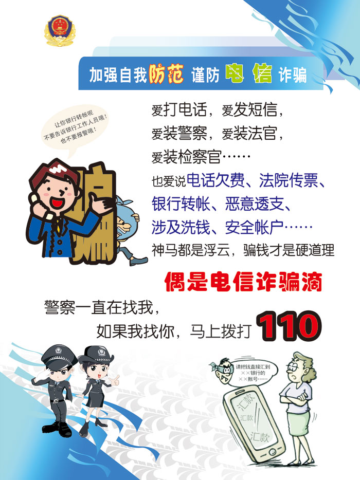 防范电信网络诈骗有招,做到以下三点就不会被骗:不信 不理 不汇款。 在信息化飞速发展给人们带来便捷的今天。各类高科技犯罪也随之蔓延。而他们的所为也给很多人带来精神上的刺激和财务上的损失。所以,对于各类信息,我们要我有效甄别,以免给自己带来不必要的损失。 1、短信诈骗:常见的主要有中奖、语音信箱留言、点歌、快递包裹、冒充亲友等,对于以上的各种手法,如果在现实生活中遇到,首先不要盲目的去满足对方的各类要求,而是要通过了解去甄别信息的真伪。这样可以避免很多不必要的麻烦。2 2、网络中奖诈骗:最常见的主要有活动庆典诈骗、冒充知名网站诈骗、幸运抽奖等。对于网页弹出这样的窗口,首先不要点击也不要相信天下会掉下来馅饼,如果点击进去后如有要求填写各类信息,不要乱填写,因为这时候你会把自己的各类信息泄露了。得不偿失。所以做到不信不理非常重要。 3、电话诈骗:常见的有公司推出活动低价促销、电话欠费、消费透支、退税电话、车祸电话、彩票电话、透支电话、点歌电话等,对于这样的来点,首先要保持头脑冷静,不要盲目去做所谓的相关要求或手续。有效的克制和清醒的头脑是避免损失的关键点。 安全提示: 1、如果电话欠费,电信公司会发送欠费催款单,而且电信通常是在月底和月初由电脑语言提示"电话欠款",并非人工直接转接。 3、千万不要相信所谓的购车退税、购房退费等谎言,如果真有退税政策出台,税务部门会通过媒体发布权威信息,不会以电话形式通知。 4、银联客服中心告知你信用卡透支等情况时,可要求对方说出你的姓名、住址、信用卡账号等资料以核实。如果你对帐户消费有疑问,可向银行查询,各银行都设有24小时固定客服热线。 5、戒除贪念,天下没有免费的午餐。 6、接到陌生电话时,注意核实对方真实身份,不可轻易汇款。同时要跟相对人或朋友核实信息的真伪。 最后,天下没有免费的午餐更不会天下掉馅饼。如果不幸受到损失一定要第一时间报警,同时保存好相应的各类单据,号码。总之,做到不信不理不汇款。就不会有损失。