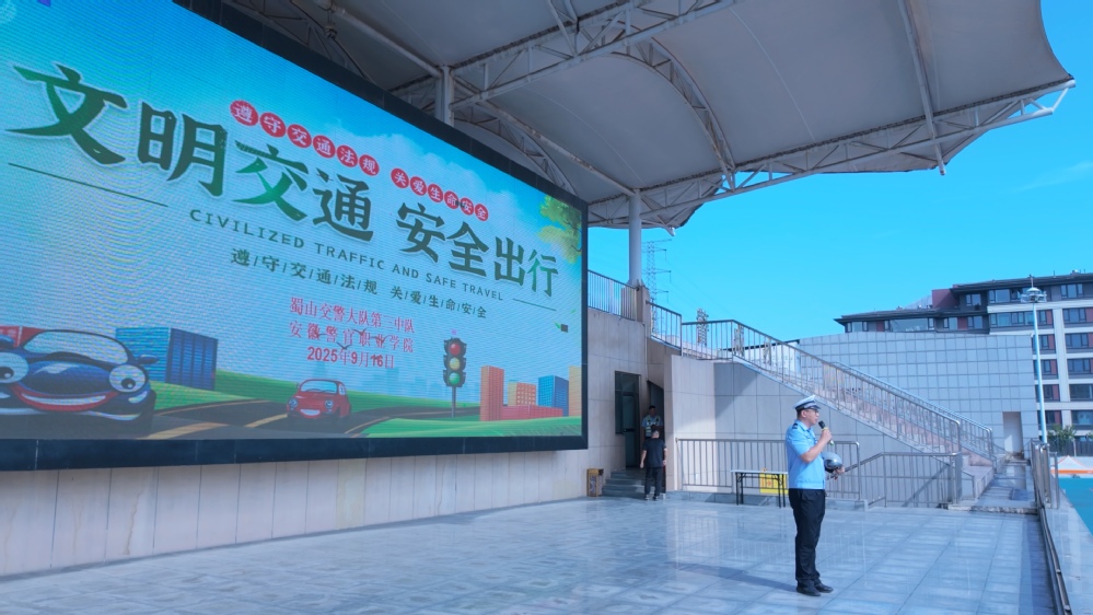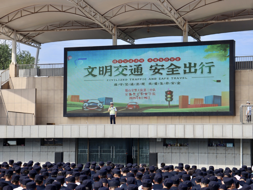 为进一步增强学生对交通安全法律法规的认识,培养文明、安全的出行习惯。9月16日,保卫处联合蜀山交警大队第三中队民警在西校区运动场开展“文明交通,安全出行”专题讲座,2025级新生聆听讲座。