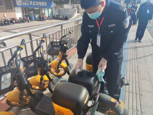 志愿者们来到共享单车停放点,把乱摆乱放的自行车摆放整齐,接着用酒精喷洒车座和车把手,用毛巾擦拭干净。同时志愿者们向过往骑车的群众积极宣传文明骑行、有序停放的重要意义,引导骑行者将共享单车摆放到相对集中的停放区域。