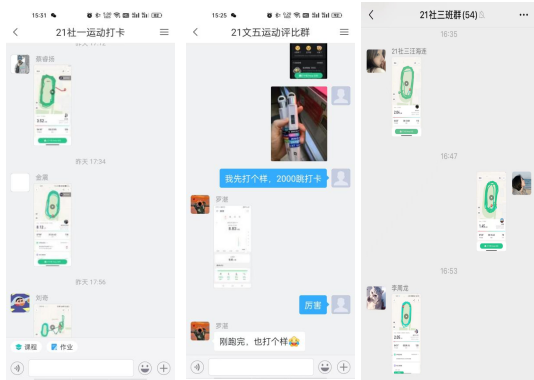 活动采用每日线上打卡监督的形式,帮助同学们养成运动习惯,增强免疫力,并对运动成绩靠前的同学进行奖励,吸引了同学们广泛参与。线上运动打卡活动包括跑步、跳绳、羽毛球等五项活动项目。参与活动的同学通过照片、视频、运动app截图等方式在班级群进行每日打卡,并在群里交流运动心得,分享健康运动方式,同学之间互相监督、互相鼓励,从而增强了每日运动的主动性和积极性。每个项目的打卡群内日日消息不断,各式各样的运动打卡展现了法律二系学子们热爱生活、健康向上的精神风貌和青春活力。