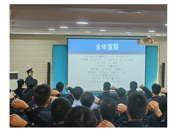 着装教育大会在庄严的国歌声中拉开帷幕,第一部分是着装展示环节,23级学生代表着不同季节、不同款式的警服进行队列动作表演,学员们身姿挺拔、步伐整齐、动作有力,利落的转身、标准的敬礼充分展示了法律二系学子扎实的警务基本功和良好的精神面貌。紧接着大会的第二部分宣讲环节,首先由23文一的施书函同学对不同款式的警服着装要求展开了介绍,大家对规范着装有了更全面、更深刻的认识。随后24文六张玉娇同学进行了人民警察礼仪宣讲,宣讲过程中警耀秘书事务所的同学穿插进行了人民警察礼仪操展示,让大家深刻体会到了警察礼仪的独特魅力。大会的最后一部分是宣誓环节,由施书函同学带领全体参会人员进行庄严宣誓:“我宣誓,保证忠于党、忠于祖国与人民、忠于法律……”整齐洪亮的宣誓声回荡在报告厅上空。