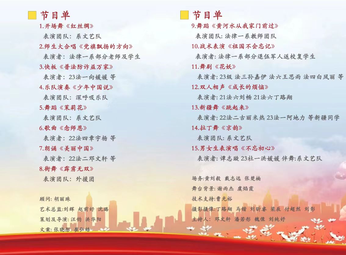 为深入贯彻“立德树人”根本任务,进一步推进课程思政和校园文化协同育人机制落实,法律一系于2023年12月15日下午在学术报告厅隆重举行了以“激扬青春梦,奋进新征程”为主题的文艺汇演,本次汇演由法律一系师生共同参与、精心策划,现场精彩纷呈,气氛热烈欢快,汇演取得圆满成功。