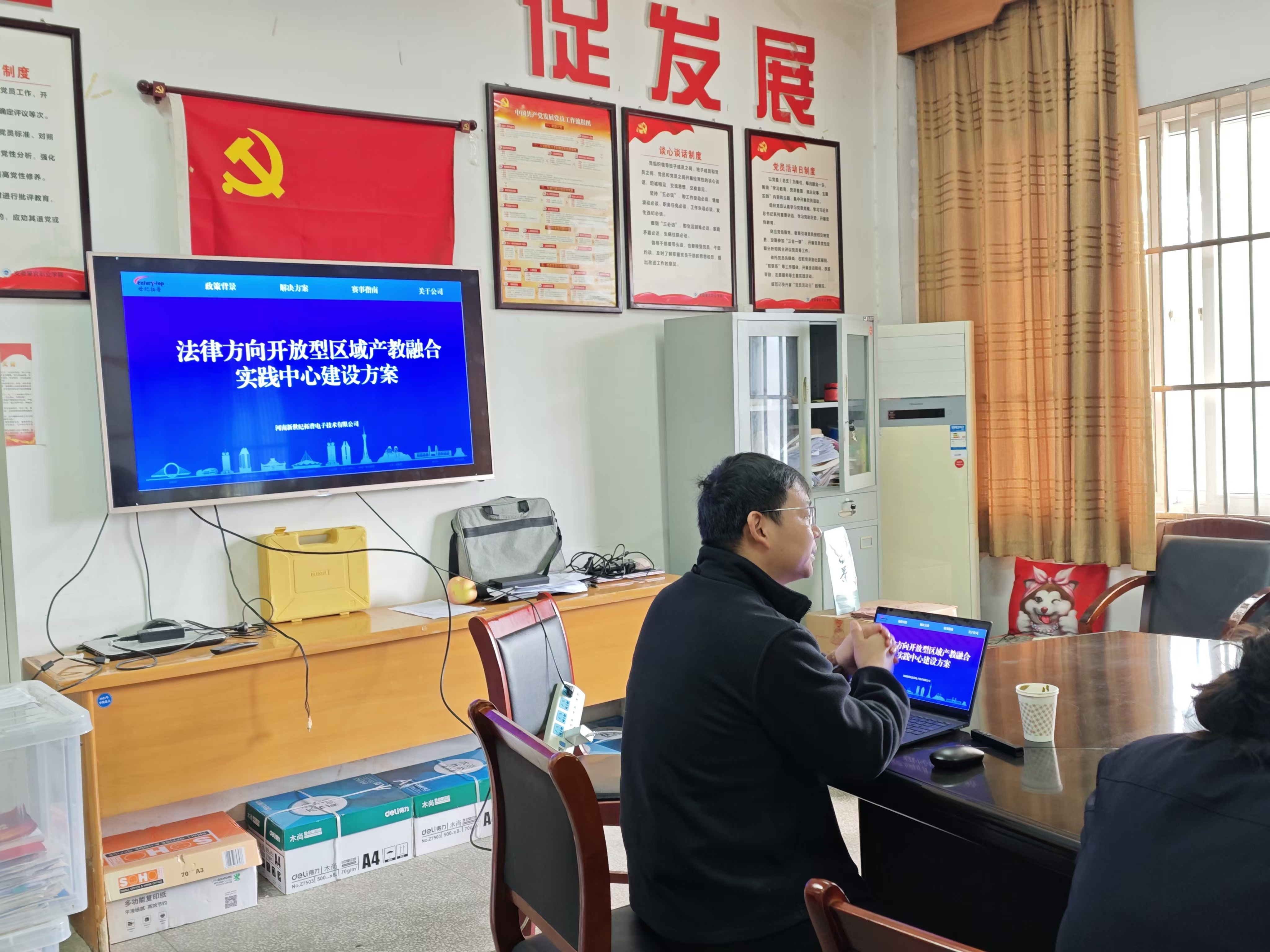 会议中,王经理详细介绍了公司20余年的发展历程及成果,并表示随着互联网、人工智能、大数据等信息技术手段的快速发展,法律相关专业数字化教学改革也势在必行,公司在法律相关专业数字化实训体系研发上已经完成相关布局,同时期待校企双方秉承各自优势开展深入合作。