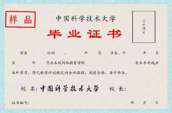 ①学生在规定学习期限内修完本专业教学计划规定的全部课程和实践教学等环节,成绩合格,并通过教育部组织的公共基础课统一考试,由中国科学技术大学颁发国民教育系列的毕业证书(网络教育),并报国家教育部电子注册,国家承认学历。