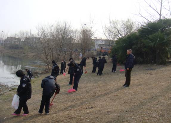 同学们组织有序的来到护城河后便开始了清理维护工作,在
