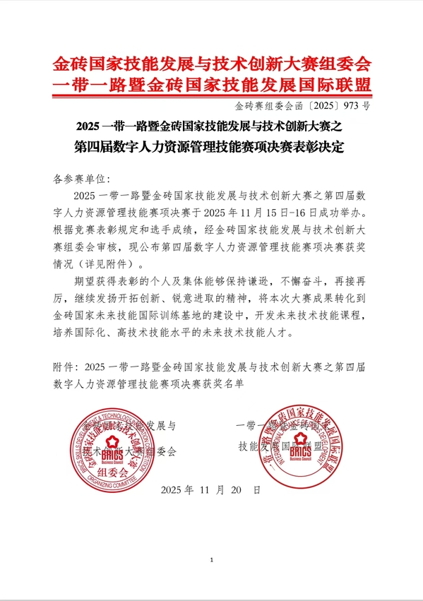 近日,2025“一带一路”暨金砖国家技能发展与技术创新大赛第四届数字人力资源管理技能赛项全国总决赛圆满落幕。由公共管理系劳动与社会保障专业汪俊硕、王志远、许旺等三名同学组成的代表队,从来自全国多所高校的160支参赛队伍中脱颖而出,荣获二等奖。