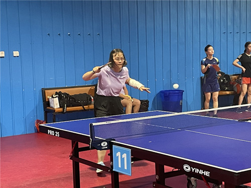 在众多运动员中,有一位选手格外引人注目,只见她左手腕部被纱布缠得严严实实,半悬空中,右手不停的挥舞着球拍,忽左忽右,忽扣忽拉,发球时咬紧牙关勉力支撑。就是这么一位选手,经过两日鏖战,她领衔的女子团体斩获女团第四名,同时摘取乙组女子单打第四名。她就是来自安徽警院的司法厅乒乓球(企事业组)运动员何咏梅。