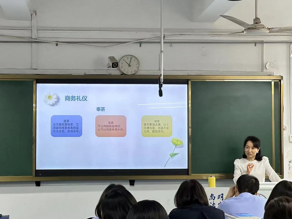 基础部副主任李小妹(主持工作)、张雯,汉语教研室主任祁郁到场听课。课堂上,刘晓敏老师通过生动的讲解和互动演示,向学生们展示了商务场合中奉茶的基本礼仪和操作规范。教学过程中,刘晓敏老师教态自然,教学节奏把握得当,课堂互动环节丰富。学生们参与积极,气氛活跃。通过实际操作与示范,学生们对商务礼仪有了更深刻的认识和理解。课后听课老师与授课老师进行了评议交流,教学效果得到一致好评。
