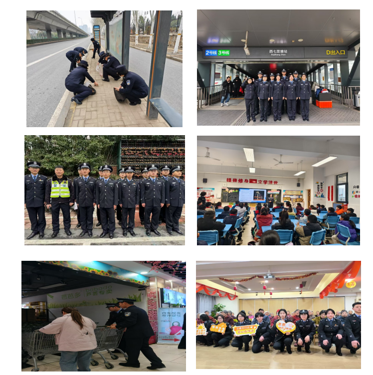 晨曦微露,同学们身着整齐的制服,手持清洁工具,走上城市的主干道。他们分组协作,清扫路面垃圾、擦拭公交站台与交通护栏,每一个动作都认真细致,过往行人纷纷投来赞许的目光。校园外,另一支警校志愿者队伍走进了合肥一六八玫瑰园小学。他们带着精心准备的安全知识小课堂,为孩子们讲述交通安全、校园安全防范要点。模拟交通场景中,同学们手把手教孩子们识别交通信号灯、正确过马路,还现场演示遇到危险如何自我保护。生动有趣的互动引得小朋友们热情高涨,踊跃参与。超市入口处,警校学子们化身引导员,帮助顾客推购物车、指引商品区域,耐心解答各类问题;在收银区,协助收银员快速装袋,维持结账秩序,让购物高峰时段的超市运转得更加顺畅。与此同时,地铁站内也活跃着同学们忙碌的身影。他们分布在各个闸机口、扶梯旁,引导乘客有序进出站、帮扶携带大件行李的乘客,用标准的手势和温暖的话语保障着客流高峰的顺畅通行。