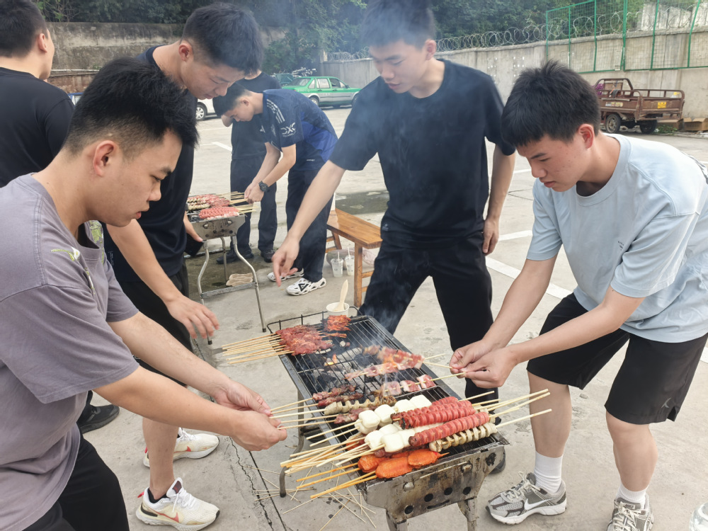 下午五时,同学们分工协作,生火、备料、腌制食材,各司其职。随着炭火噼啪作响,烤肉滋滋冒油,诱人的香气在空气中弥漫开来。大家围坐一起,分享美食与趣事。班干部还组织了趣味游戏,现场气氛热烈。藏蓝制服的严谨与此刻的轻松交织,展现了警校生朝气蓬勃的另一面。