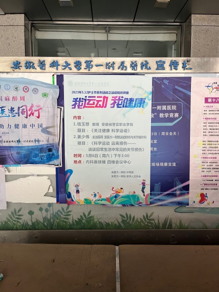 5月6日下午3点,警体部钱玉想受邀至安医大一附院绩溪路院区内科医技楼四楼会议中心,进行了题为“关注健康、科学运动”的知识讲座。