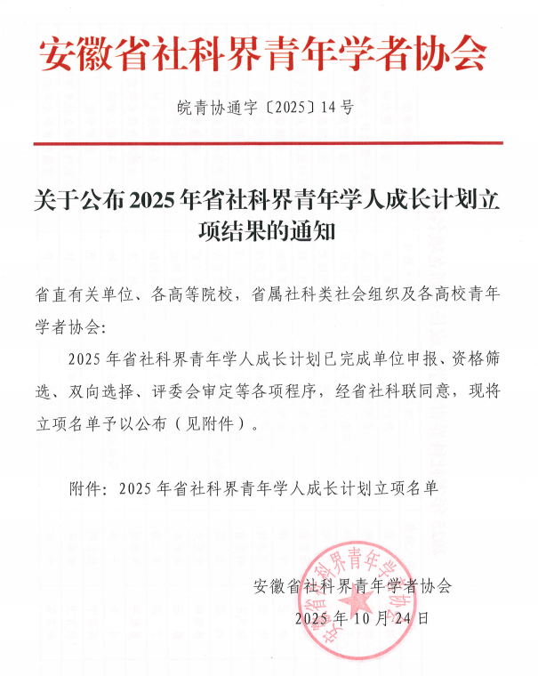 近日,安徽省社科届青年学者协会公布了2025年省社科界青年学人成长计划立项结果,我院杨颖、张洁、孙佳、郭琪、王宁五名青年教师获批立项。