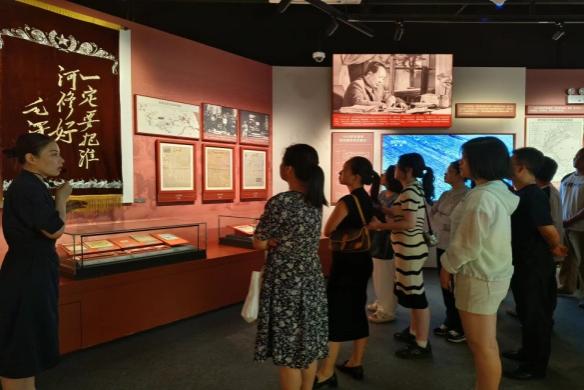 在讲解员的引导下,师生们参观了“山河安澜——淠史杭灌区主题展”。 淠史杭灌区位于安徽省中西部和河南省东南部,是淠河、史河、杭埠河三个毗邻灌区的总称。在1958年8月至1972年底的14年中,皖西人民在党的带领下,自力更生、奋发图强,创造了堪称“人间奇迹”的治水史诗。淠史杭灌区是中华人民共和国成立后建成的灌溉面积最大、唯一跨长江淮河两大流域的特大型灌区,被誉为“新中国水利建设史上一颗光辉灿烂的明珠”。