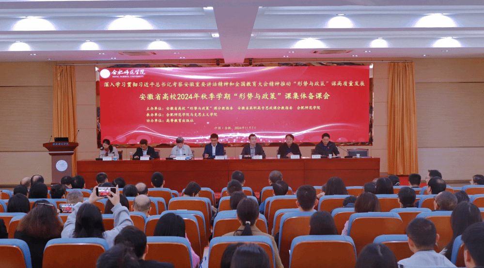 11月2日,全省高校2024年秋季学期“形势与政策”课集体备课会在合肥召开。本次会议由安徽省高校“形势与政策”课分教指委、安徽省高职高专思政课分教指委和合肥师范学院共同主办。来自全省近百所高校马克思主义学院负责人、教研室主任及任课教师160余人参会。我校马克思主义学院王芸、方玲燕两位老师到会。备课会以“深入学习贯彻习近平总书记考察安徽重要讲话精神和全国教育大会精神,推动‘形势与政策'课高质量发展”为主题,安排了主旨报告、专题辅导报告与教学展示等内容。