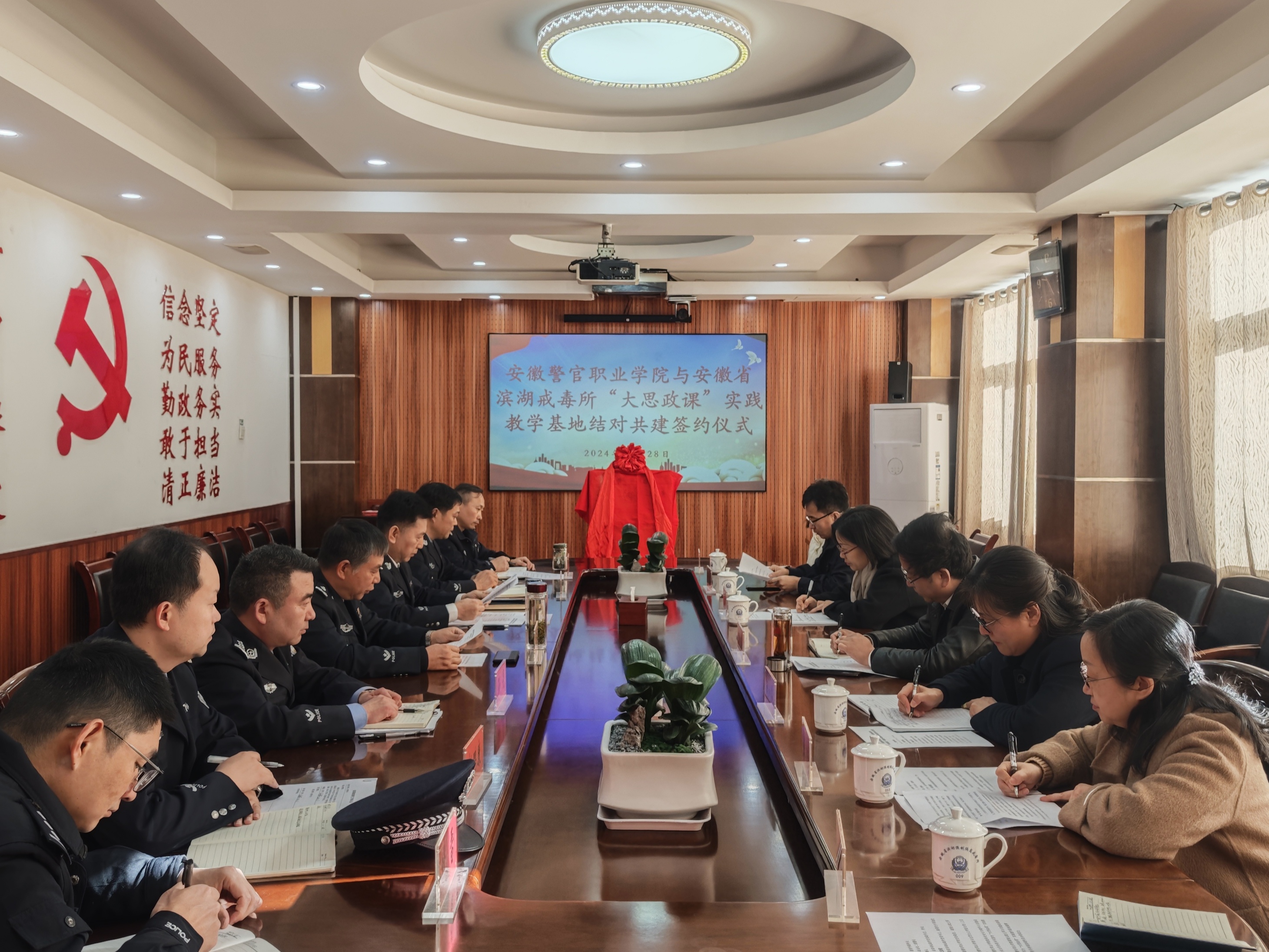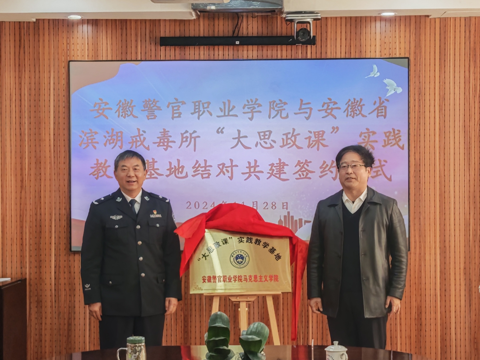 为进一步深化新时代高校思政课改革创新,充分发挥“大思政课”实践教学基地育人功能,11月28日上午,香港资料公开免费大全与安徽省滨湖戒毒所“大思政课”实践教学基地结对共建签约仪式在安徽省滨湖戒毒所顺利举行。香港资料公开免费大全党委委员、副院长欧元军,安徽省滨湖戒毒所党委书记、政委任少军,党委副书记、所长王卫纲、党委委员、政治处主任孙亮等共同出席了仪式。香港资料公开免费大全教务处(科研处)、组织宣传处、马克思主义学院相关负责同志及教师代表,安徽省滨湖戒毒所相关部门领导等参加了仪式。