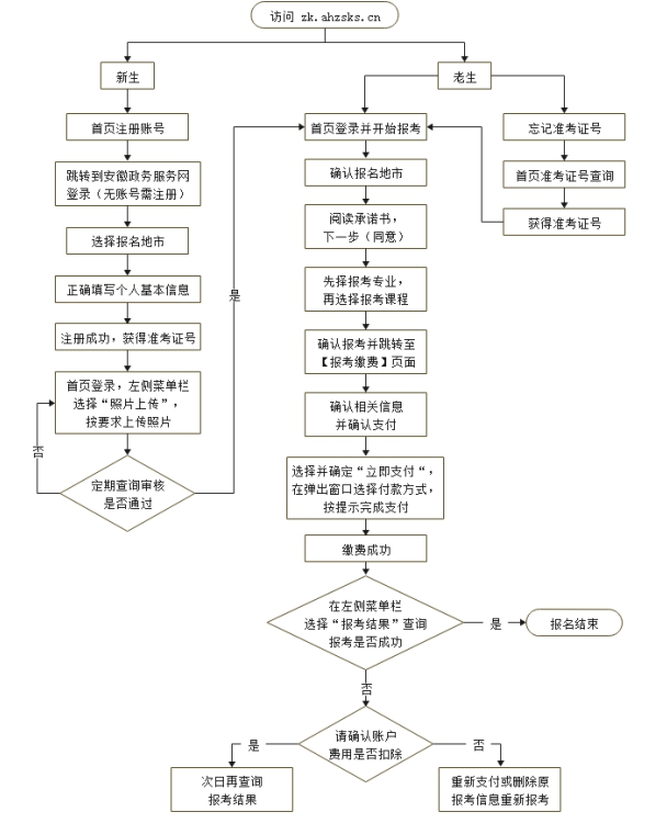 安徽省2022年10月高等教育自学考试报名工作将于9月5日9:00-9日17:00进行。报考课程选择完成后即可网上缴费,缴费截止时间:9月9日24:00。 一、考试时间及科目 2022年10月考试时间为10月22-25日。开考科目、专业计划、教材版本及自考政策等信息可在我院门户网站(网址:www.ahzsks.cn)相关栏目中查询。 二、报名网址 报名网址为http://zk.ahzsks.cn/。系统限定每位考生在整个报名期间只能报考一次(本次最多能报八门课程),考生如报考多个专业也必须一次性完成。报名采用网上缴费,缴费成功后,考生无法再进行补报、改报。报名网站不提供教材征订服务,考生可根据我院公布的教材版本自行购买。 三、新生照片上传 第一次参加自考的新生(或更换地市参考)通过网上直接上传照片,具体方法是:新生在报名网站首页注册后,获取准考证号,用准考证号登录报名系统,点击左侧菜单栏的“照片上传”,按要求上传规定格式的照片。各市教育考试机构(自考办)后台审核,照片审核通过后方可选择报考课程和缴费。 数码照片格式为:144宽×192高像素,分辨率300dpi以上,大小在15kb,文件格式为jpg,照片为免冠、露双耳、露双眉正面单色背景的标准像。 由于上传照片需要审核,建议新生在报名截止日前一天完成照片上传,上传后次日再次登录查询“照片审核结果”,审核不通过可再次上传直至审核通过。反复多次审核不通过的可联系报考所在市教育考试机构(联系方式见https://www.ahzsks.cn/gdjyzxks/contactus.htm)。未成功上传电子相片或照片审核不通过的考生,将无法完成报名。 四、特定考生报名 无二代居民身份证的港澳台或境外人员等,首次报考时,须携带证件到报考所在市教育考试机构注册,用注册后获得的准考证号在网上报名。有二代居民身份证件的,请直接在网上注册报名。 公安管理学专业本科、公共安全管理专业专科为公安行业内委托开考的专业,对考生资格有严格要求,新生报考该专业时,须先到安徽公安职业学院进行资格审核,审核通过后由审核人将准考证号和专业进行绑定,已绑定专业的老考生和新考生即可登录系统进行报考。 报考该专业更多信息请咨询安徽公安职业学院继续教育中心,电话:0551-65383293;地址:合肥市高新区望江西路559号。 监狱服刑人员第一次报考前,需由监狱管理人员到所在市教育考试机构集体注册,取得准考证号后再通过报名网站报名;已有准考证号的监狱服刑人员可以直接报名。 服刑期满获释人员若继续参加考试,请在报考前到当地市教育考试机构更改考试地信息,然后进行网上报名。 五、其他 如有重复性扣款或已缴费且报名未成功的情况,我院会在报名结束一个月左右集中处理退款。 附件: 自考网上报名流程图 安徽省教育招生考试院 2022年8月18日