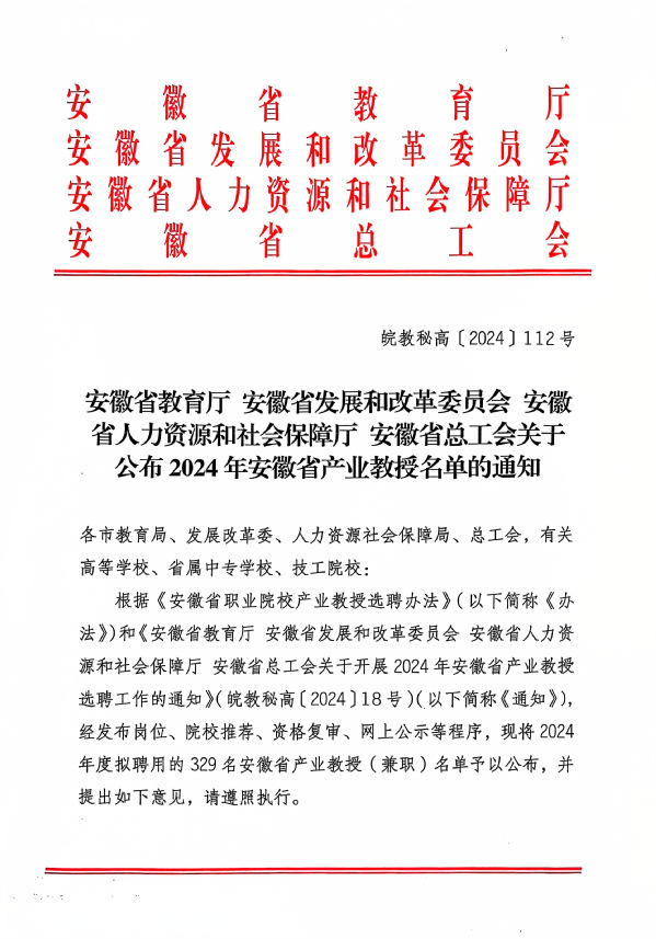 根据《安徽省教育厅安徽省发展和改革委员会安徽省人力资源和社会保障厅 安徽省总工会关于公布2024年安徽省产业教授名单的通知》(皖教秘高〔2024〕112号)文件精神,我院推荐申报5位兼职教师获批安徽省高职院校类产业教授。
