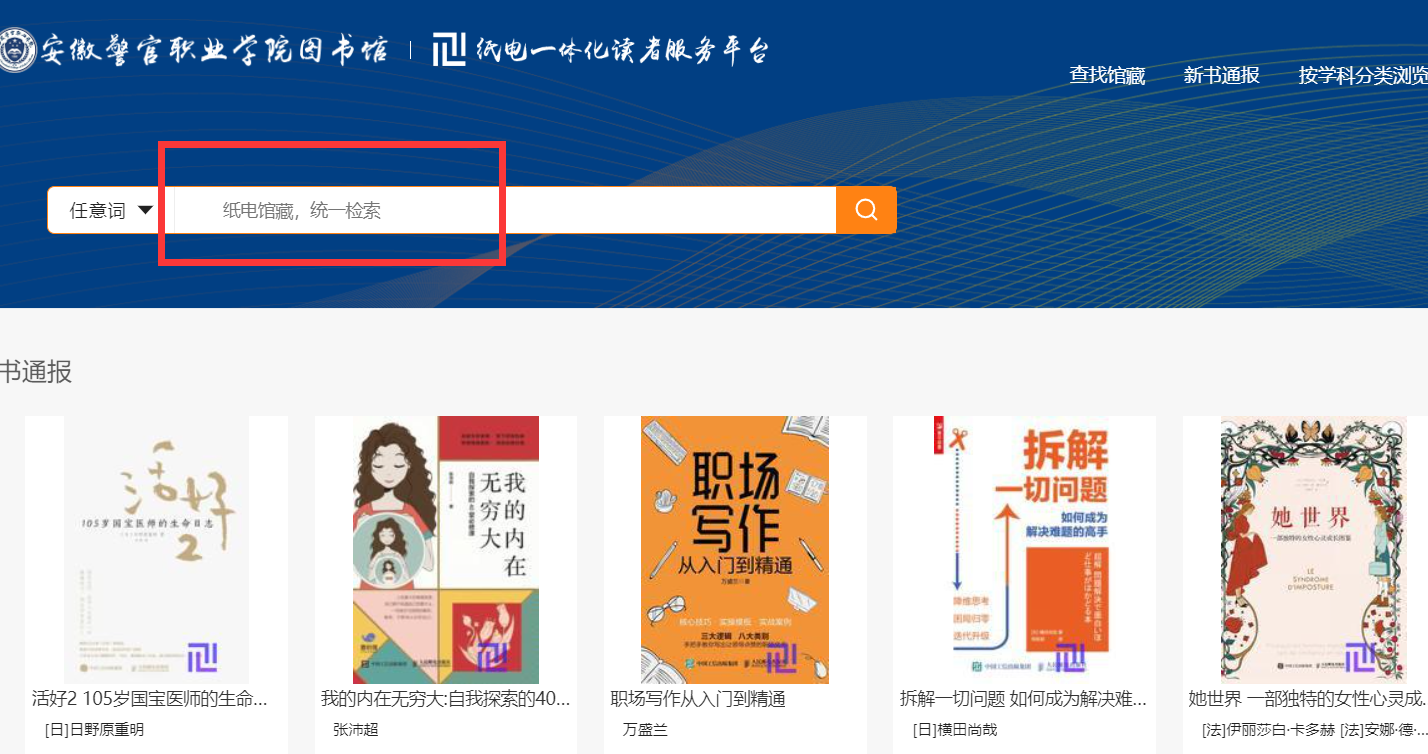 2.在网站首页红框内输入检索词,可以进行馆藏书目检索。